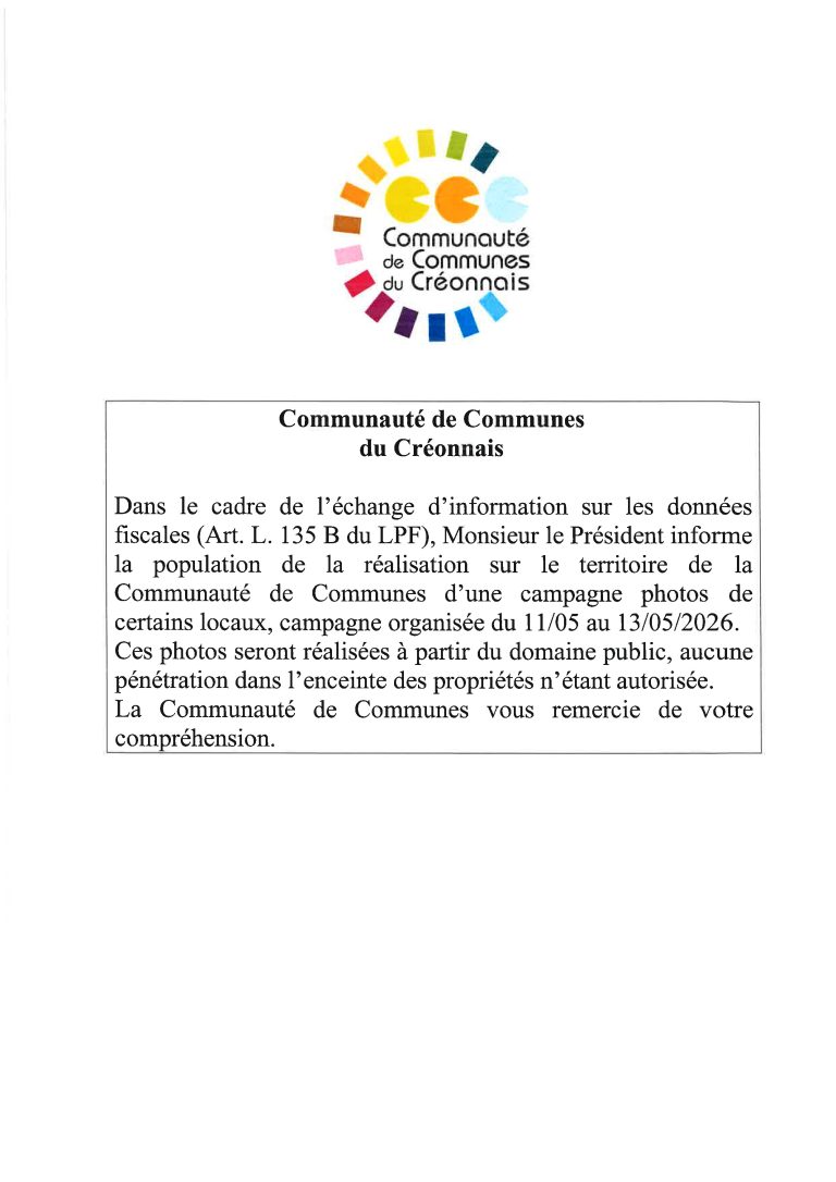 Information de la Communauté des Communes dans le cadre de l’échange d’information sur les données fiscales : réalisation sur le territoire d’une campagne photos de certains locaux du 11 au 13 mai 2026.