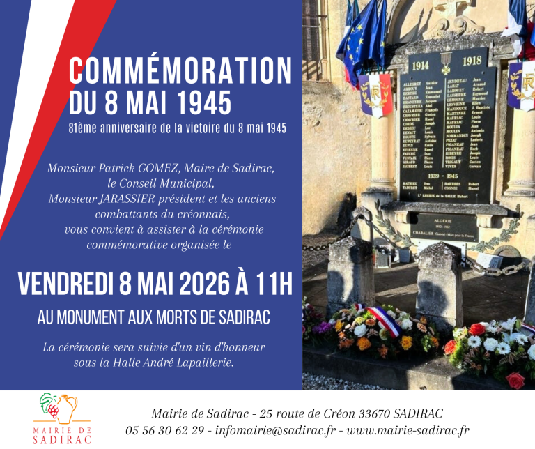 Monsieur Patrick GOMEZ, Maire de Sadirac, le Conseil Municipal, Monsieur JARASSIER président et les anciens combattants du créonnais, vous convient à assister à la cérémonie commémorative de la Victoire du 8 mais 1945 organisée le vendredi 8 mai à 11H. Un verre de l’amitié sera offert sous la Halle André Lapaillerie à l’issue de la cérémonie.