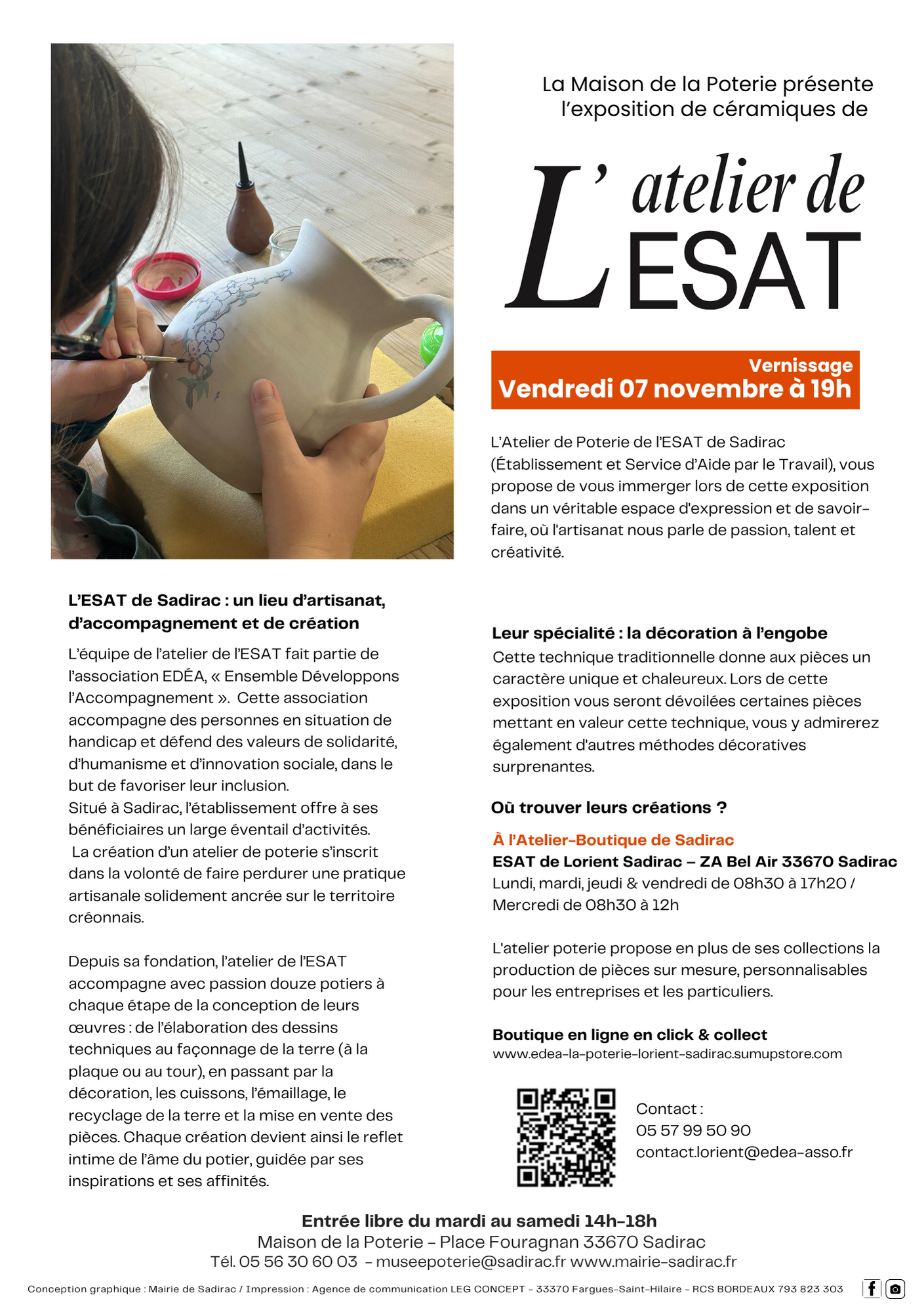 Depuis 2009, l’Atelier de Poterie de l’ESAT de Sadirac-Lorient fait rimer savoir-faire artisanal et créativité. Douze potiers y explorent chaque étape de la création : conception, façonnage, décoration, cuisson et émaillage.