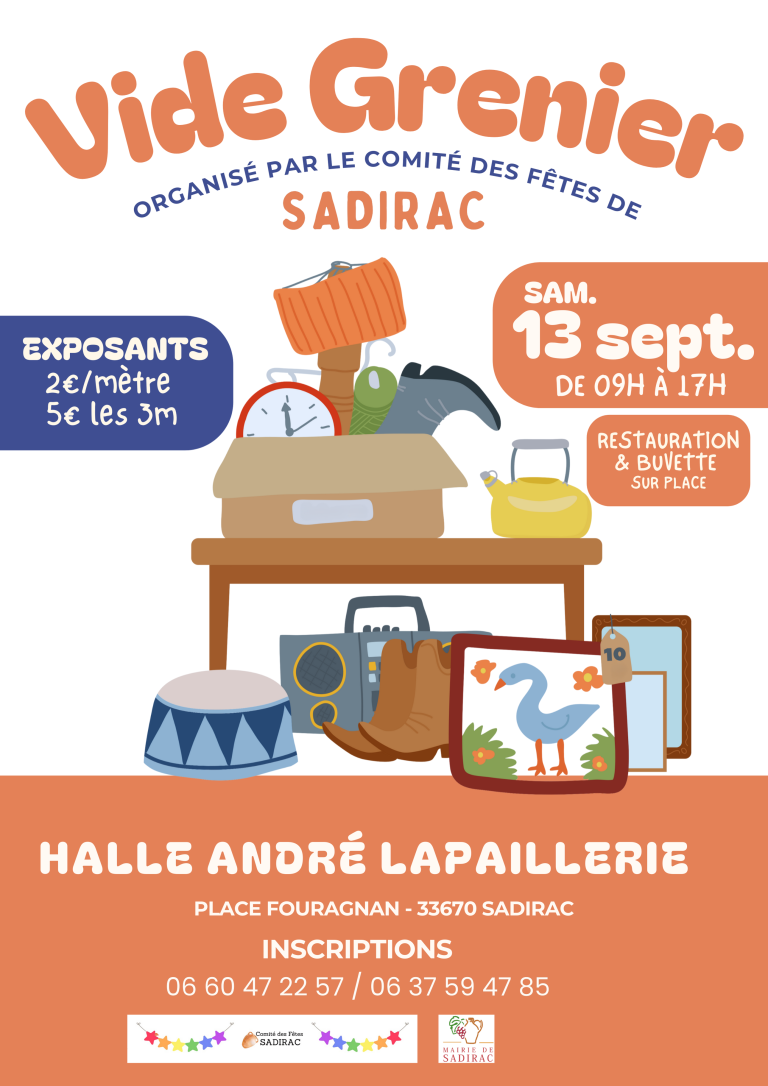 Le Comité des Fêtes de Sadirac vous invite à son grand vide-grenier annuel ! Venez chiner, vendre, troquer dans une ambiance conviviale !